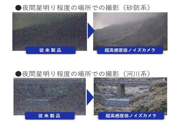 新製品は、微弱な光を捉える「高効率化特殊光学系(注2)」と、イメージセンサで検出した信号のノイズに対して抑制・低減を2段階で処理する「映像適応型デジタル信号処理エンジン(注3)」の2つの独自技術を搭載しています。これにより、当社の従来製品に比べ高感度撮影時のノイズを約75%(注4)低減することができ、従来製品ではノイズに埋もれて視認できなかった対象物の可視化が可能になります。昼夜・天候を問わず対象物を映像化して遠隔からモニタリングすることや、画像解析などの技術と組み合わせて様々な現場を映像化することが可能となり、監視業務の自動化・効率化によるDX化を支援します。
