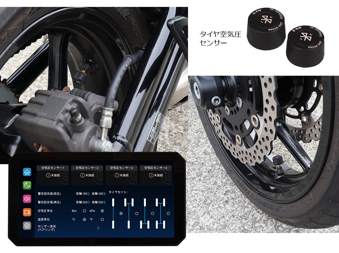 「空気圧」や「タイヤ温度」を秒間隔でモニタリングするタイヤ空気圧監視システム搭載。高圧・低圧の警告値の設定が前輪・後輪別々にできます。