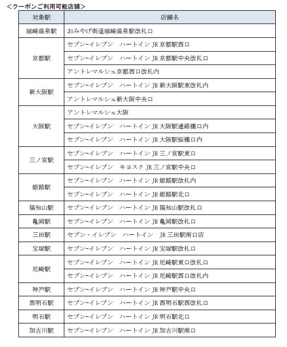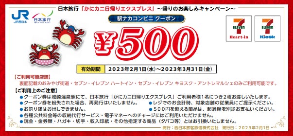 「駅長おすすめ駅プラン『かにカニ日帰りエクスプレス』(往復JR特急指定席+「カニ料理」のセット)」をご利用の方に、カニ料理をご堪能いただいた後のお帰りのひとときにも列車の中で皆様でお楽しみいただけるよう、城崎温泉駅や特急停車駅の駅ナカコンビニ店舗等でお好きな商品に引換えできる「駅ナカコンビニクーポン」1,000円相当をプレゼントするキャンペーンを期間限定で実施します。