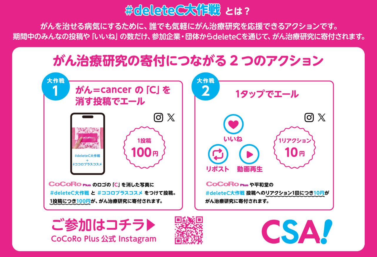 9月17日(火)~9月30日(月)までの間、平和堂が運営するコスメ&バラエティショップ「CoCoRo Plus」のロゴの「C」を消した画像や動画に「#deleteC大作戦」と「#ココロプラスコスメ」をつけてSNSに投稿・拡散すると、1投稿あたり100円ががん治療研究に寄付されます。