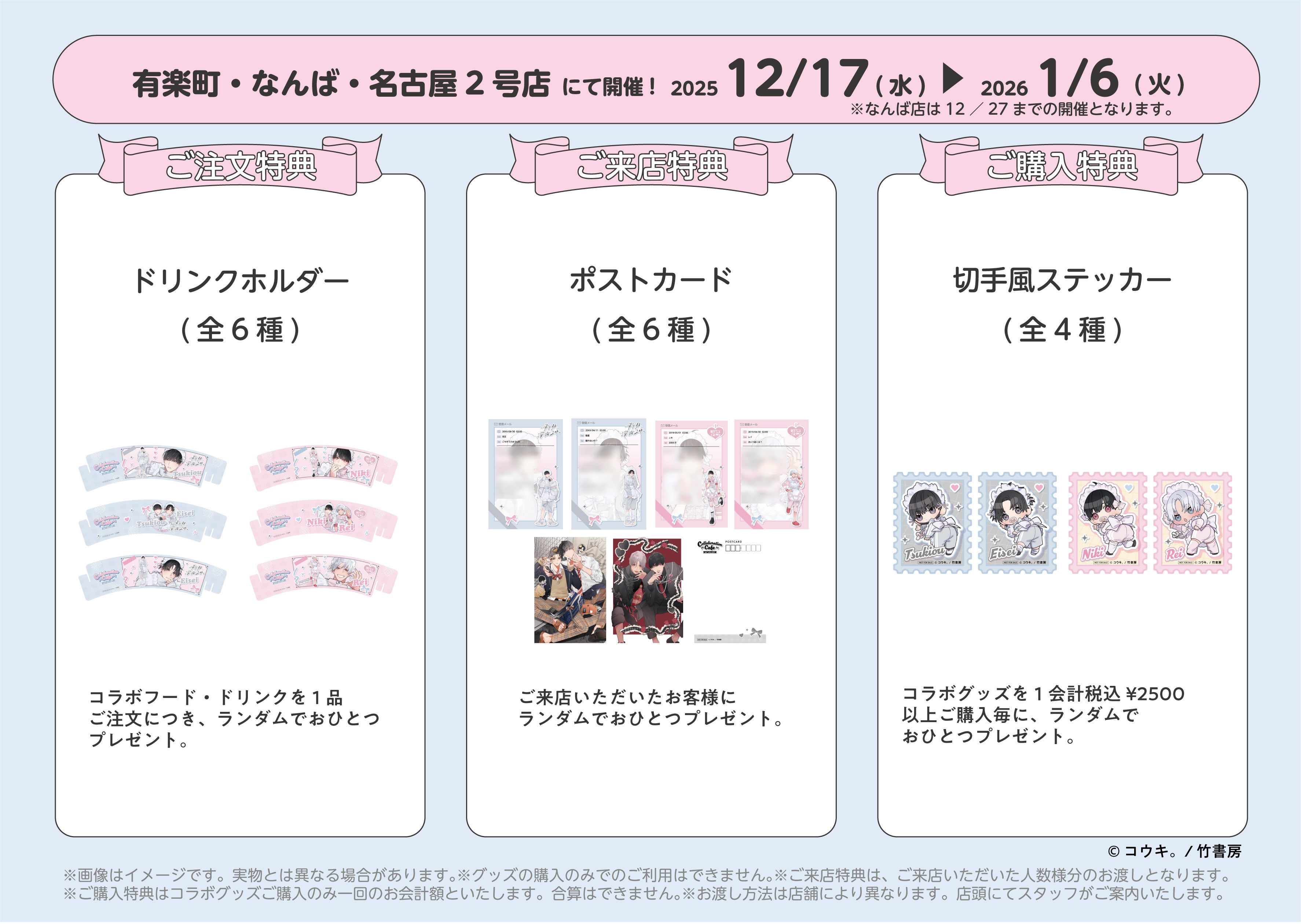 株式会社竹書房(所在地:東京都千代⽥区 代表取締役社⻑:宮⽥ 純孝)は、BLレーベルQpa作品『制服、深夜2時。』『I♡歌舞伎町』(コウキ。 著)のコラボレーションカフェを12月17日(水)11:00より開催いたします。