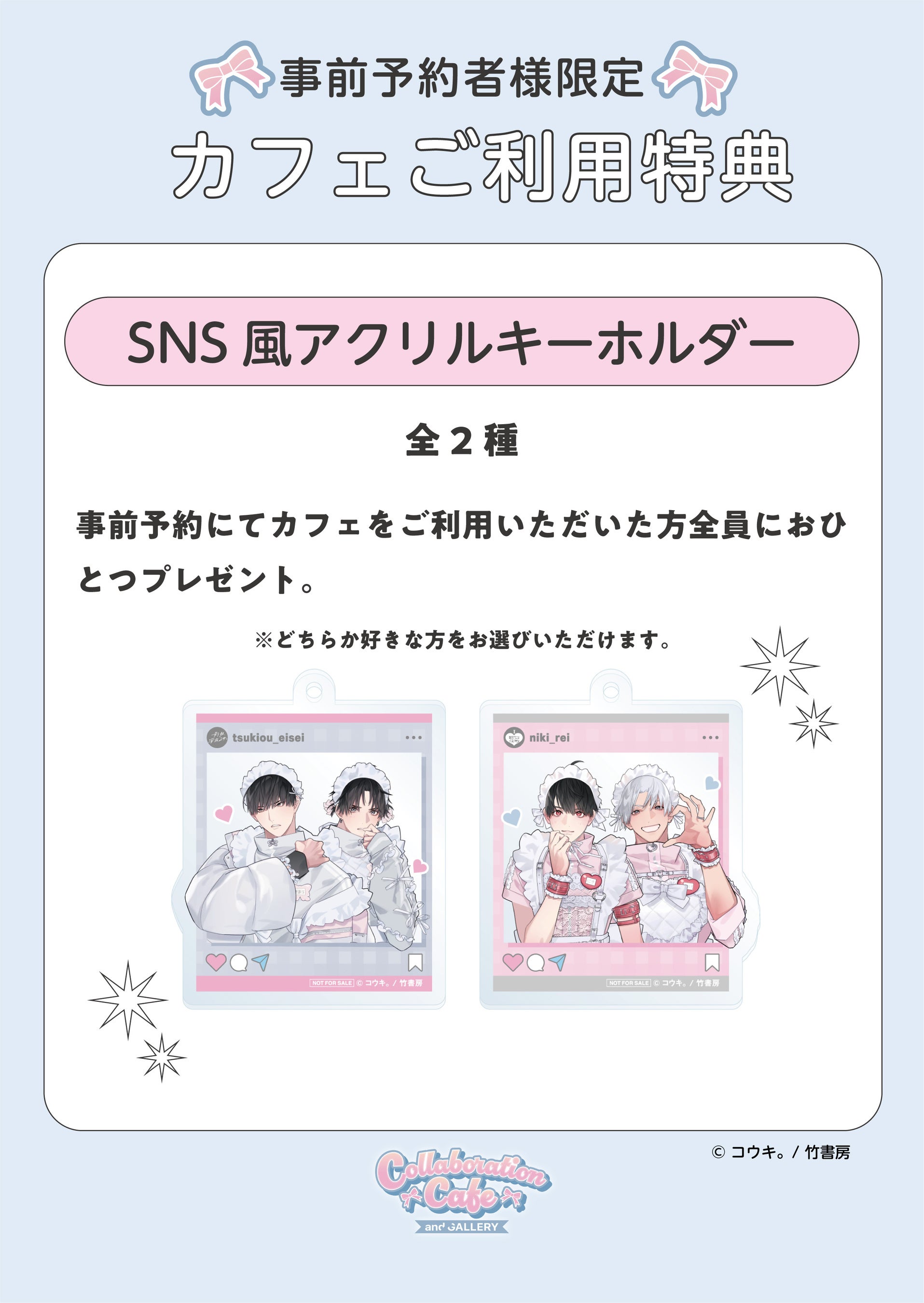 『制服、深夜2時。』『I♡歌舞伎町』コラボメニュー1品のご注文につき、ドリンクホルダー(全6種)をランダムで1枚プレゼント。関連グッズをご購⼊2,500円(税込)ごとに切手風ステッカー(全4種)をランダムで1枚プレゼント。ご来店いただいたお客様にポストカード(全6種)をランダムで1枚プレゼント。事前予約にてカフェをご利用いただいたお客様にSNS風アクリルキーホルダー(全2種)全員におひとつプレゼント。※どちらか好きな方をお選びいただけます。