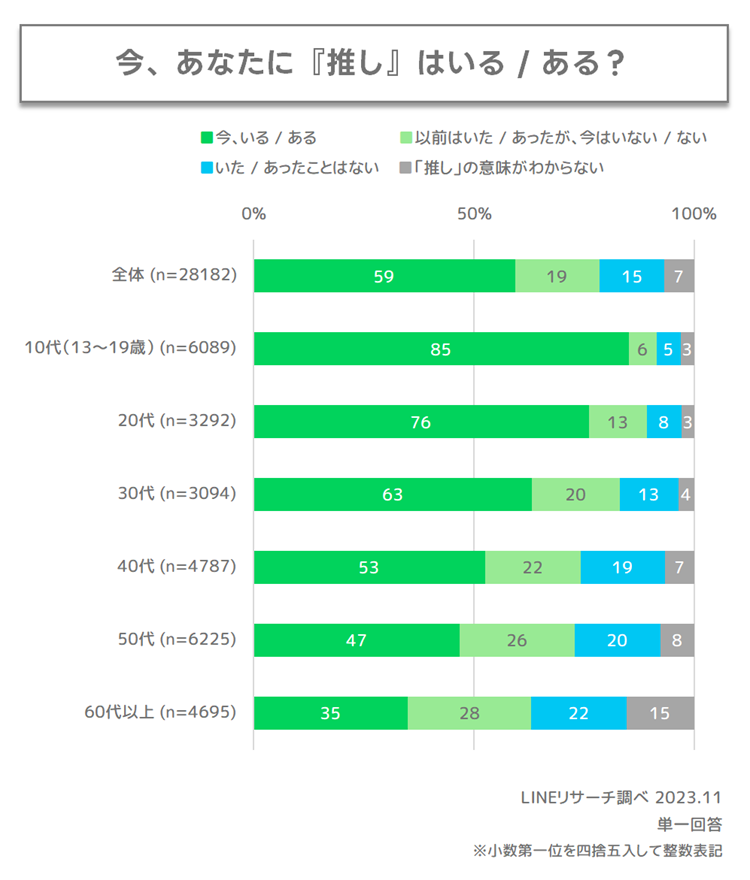 【LINEリサーチ】推しが「今、いる」という人は約6割。10代では8割台後半と、若年層ほど割合が高い傾向