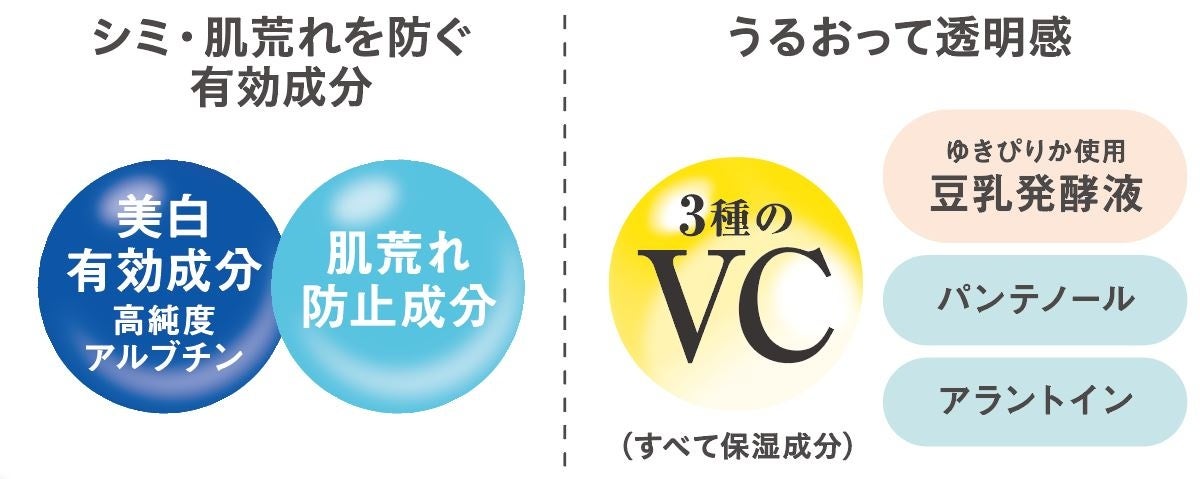 美白に適した豆乳発酵液※3、美白有効成分※6に加え、新たに3種のビタミンC誘導体※7を配合。