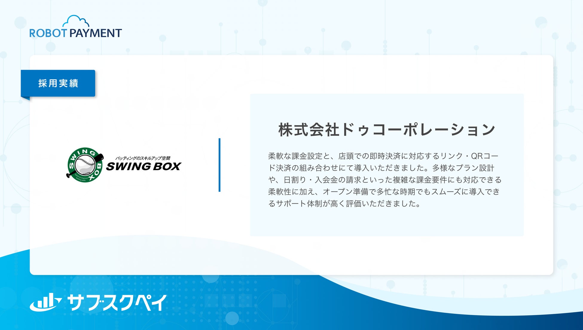 株式会社ROBOT PAYMENT(本社:東京都渋谷区、代表取締役執行役員CEO:清久 健也、証券コード:4374、以下「ROBOT PAYMENT」)は、サブスクリプション管理システム「サブスクペイ」が、株式会社ドゥコーポレーションが提供するバッティングセンターのサブスクリプションサービス「スウィングボックス」で採用されたことをお知らせします。