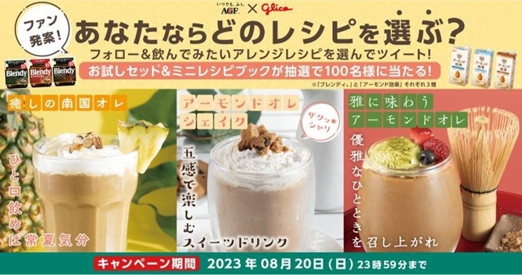 キャンペーン期間中、AGF®【公式】Twitterアカウント(@agfcm2)にて、飲んでみたいアレンジレシピを選んでツイートすると、「ブレンディ®」インスタントコーヒー、「アーモンド効果」のお試しセットと、アレンジレシピをまとめた限定ミニレシピブックが抽選で100名様に当たります。限定ミニレシピブックには、「ブレンディ®」と「アーモンド効果」の両ブランドをいずれも愛するファンの方々とのファンミーティングで考案したオリジナルレシピの“カフェアーモンドオレ”を掲載し、本レシピはAGF®Loungeサイトでもキャンペーン開始と同時に公開いたします。