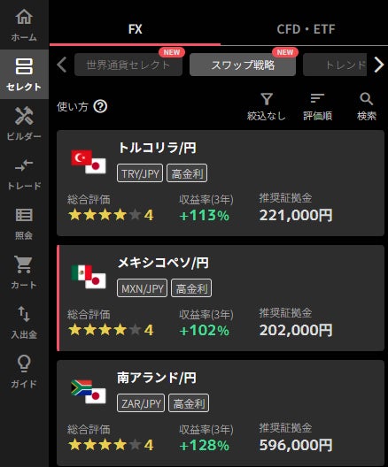 選んでまかせる自動売買セレクトの「スワップ戦略」カテゴリーに、スワップ運用に特化した自動売買が実装されています。