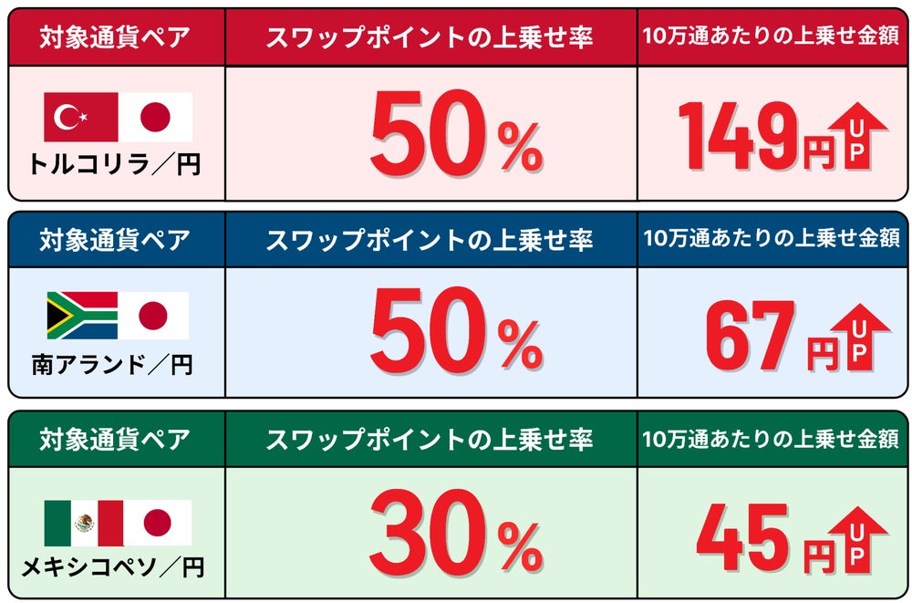インヴァスト証券株式会社(本社:東京都港区、代表取締役社長:伊藤 誠規、以下「当社」)は、外国為替取引サービス「トライオートFX」において、トルコリラ円(TRY/JPY)、南アフリカランド円(ZAR/JPY)、メキシコペソ円(MXN/JPY)の新規買建玉を対象に、期間中の“建玉増加分”に対してスワップポイントを増額するキャンペーンを2025年11月3日〜11月28日まで実施します。