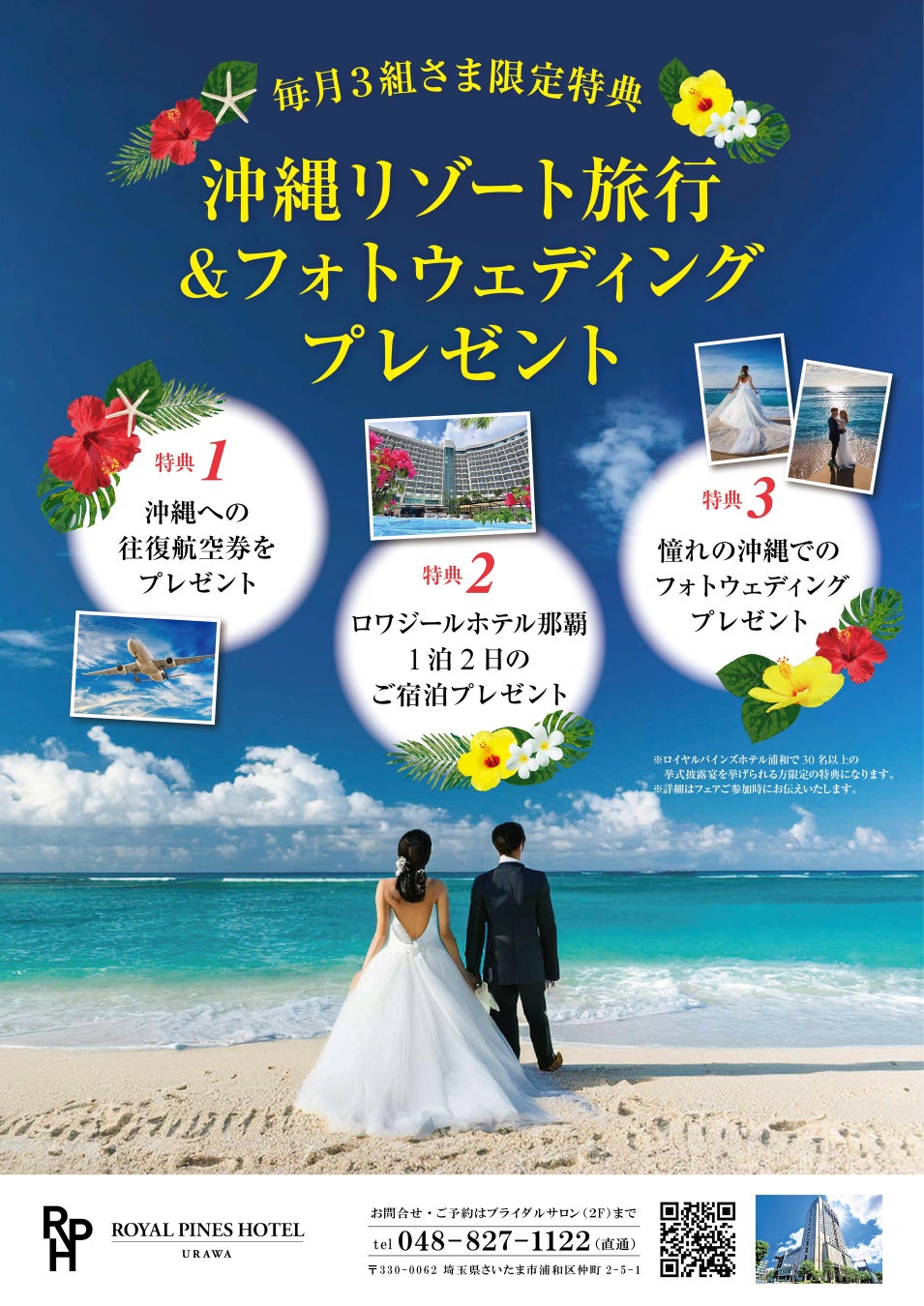 沖縄リゾート旅行&フォトウェディングプレゼント!ロイヤルパインズホテル浦和 毎月3組様限定の特別ウェディングキャンペーン