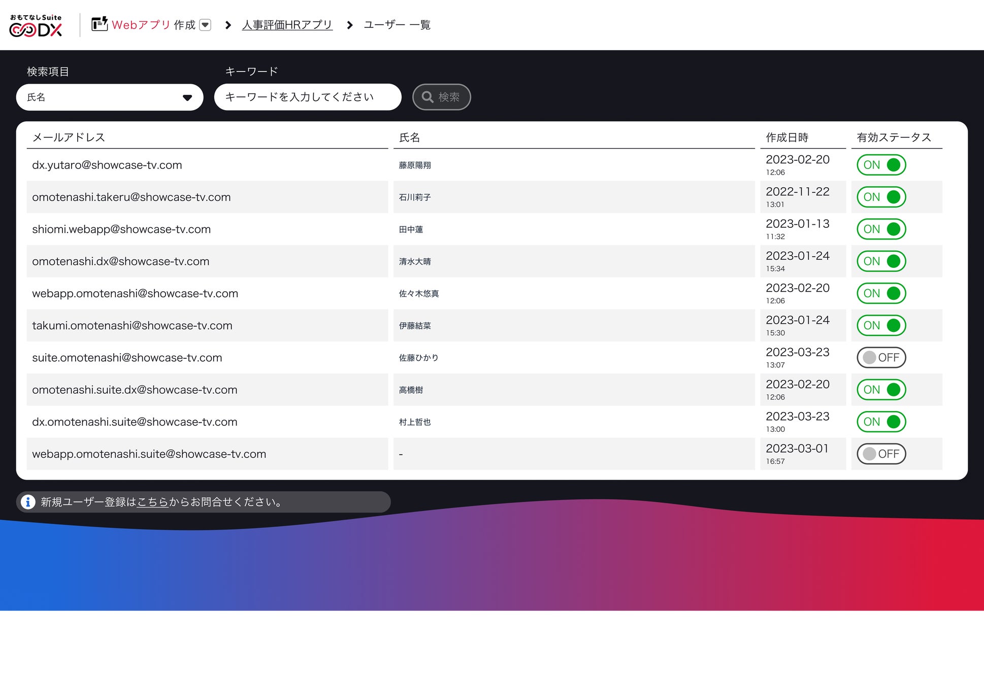 また、登録されたユーザーを一覧から確認することも可能で、一覧からユーザーアカウントの有効、無効を選択することができます。
