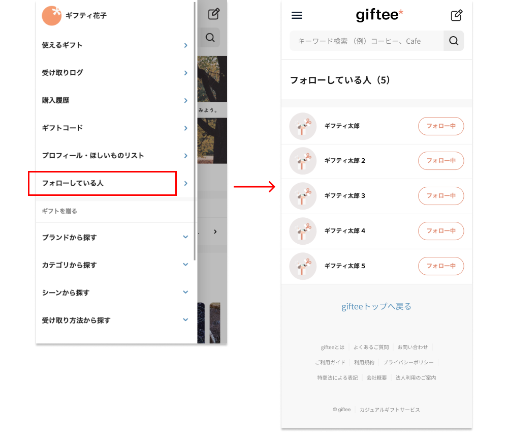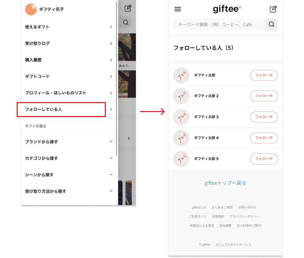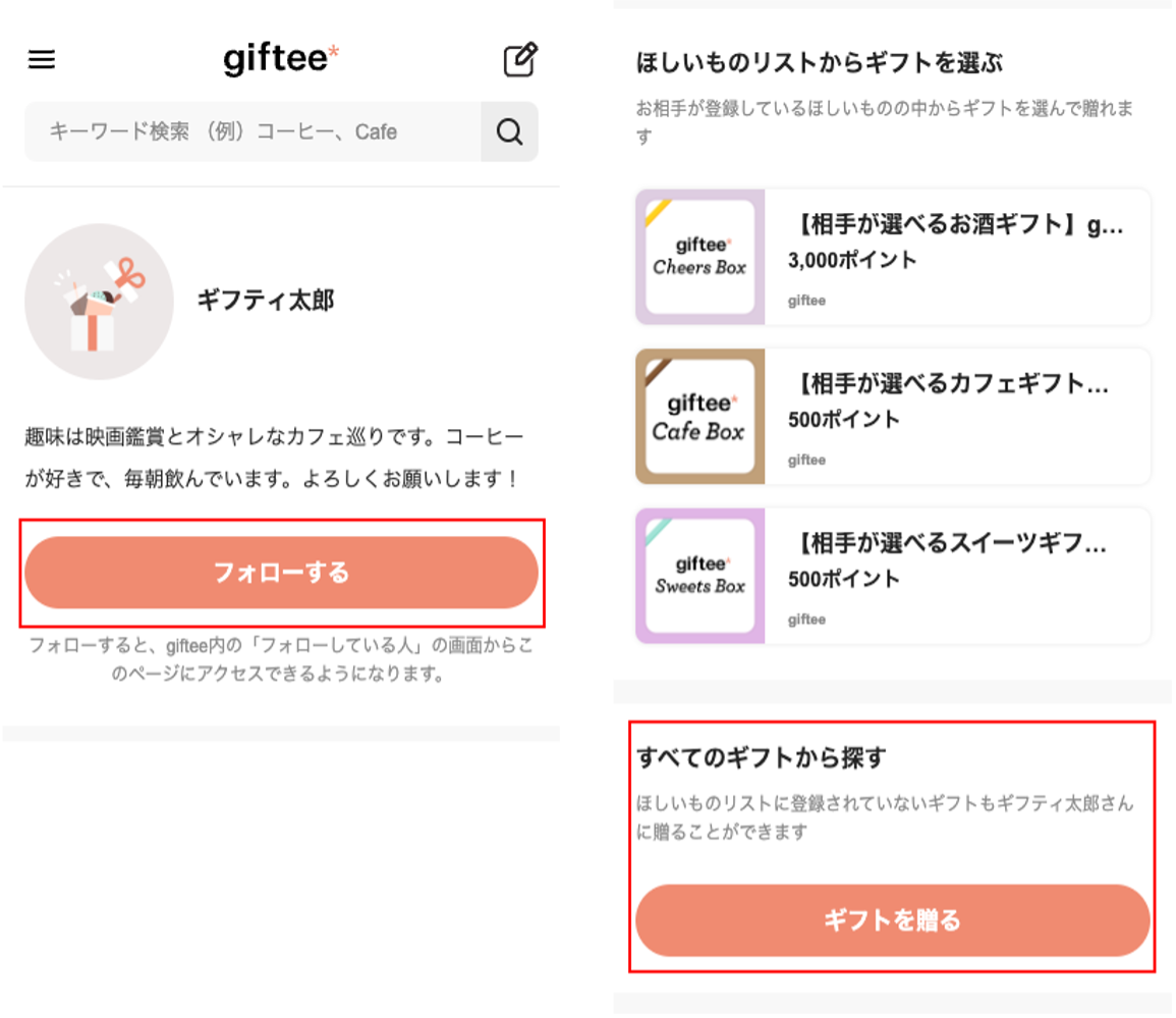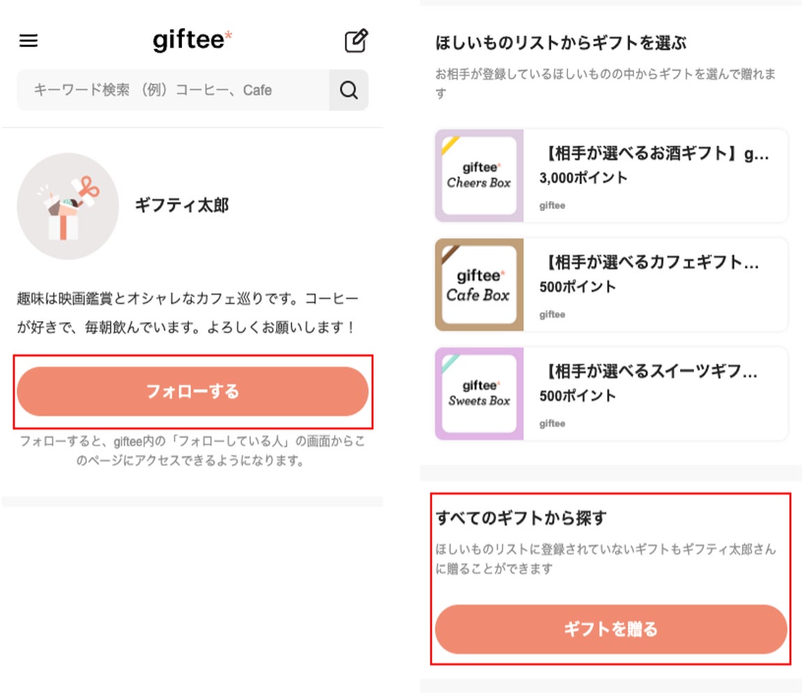 他のユーザーの「プロフィール・ほしいものリスト」からお相手をフォローいただけます。フォローすることで、今回新たに追加した「フォローしている人」画面から、その方の「プロフィール・ほしいものリスト」にアクセスすることができます。(「ほしいものリスト」の作成やフォローには「giftee®︎」への事前登録(無料)が必要です)