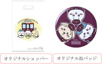 また、コラボレーショングッズを一度のお会計で4,000円(税込)以上お買い上げの方に、オリジナル缶バッジを進呈します。※オリジナルショッパーは、「HANKYU DENSHA SHOP」「ちいかわマーケット」などでのお渡しはありません。