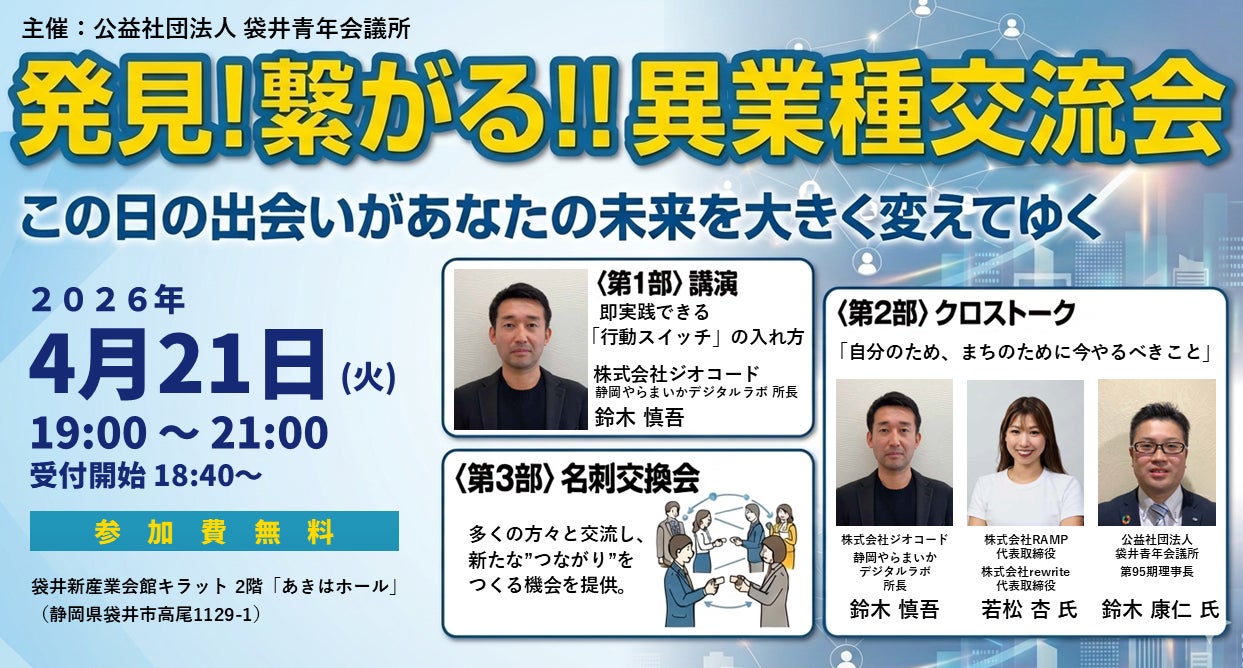 Webマーケティングとクラウドセールステック事業を展開する株式会社ジオコード(本社:東京都新宿区、代表取締役:原口 大輔、証券コード:7357)は、2026年4月21日(火)に公益社団法人 袋井青年会議所が主催する「発見!繋がる!!異業種交流会」において、静岡やらまいかデジタルラボ所長の鈴木慎吾が登壇・講演することをお知らせします。