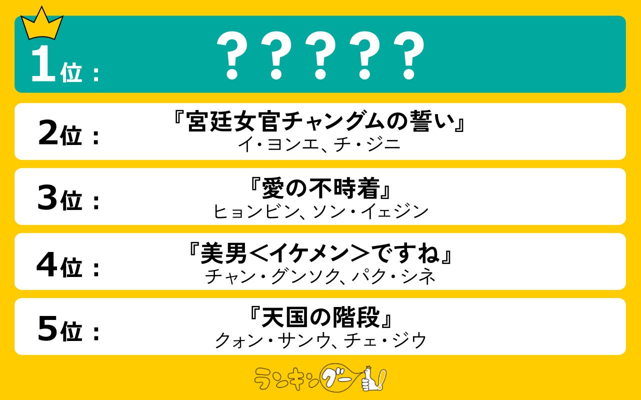 ランキングー!では最高の韓国ドラマをピックアップし、ランキングを調査。全年代の女性6,334名にアンケートを行い、TOP10を決定しました。ここではTOP5をご紹介します。