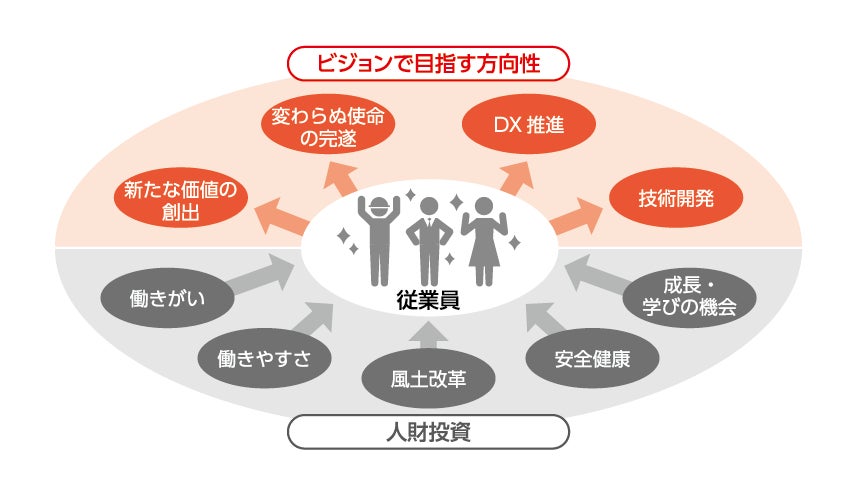 具体的には、グループ一丸となって取り組む風土を醸成するとともに、人財の多様化および高度化のため、先行する「安全健康」に関する取り組みや、新型コロナウイルスへの対応等で加速された「働きやすさ」の充実に加え、「働きがい」や「成長・学びへの機会」という切り口で人財投資を進めています。