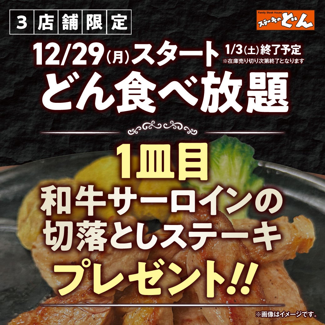 「ステーキのどん」で、2025年12月29日(月)~2026年1月3日(土)にて、3店舗限定企画の『どん食べ放題年末年始イベント』として、和牛サーロインの切落としステーキを1皿プレゼント致します。