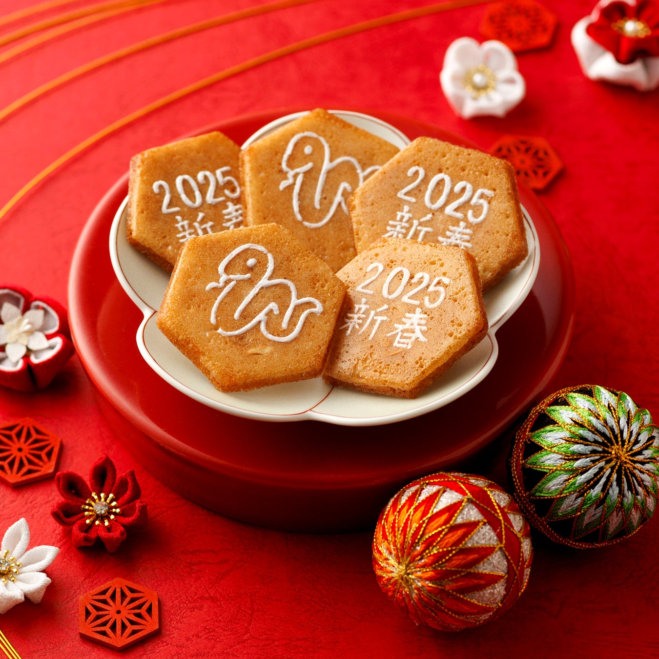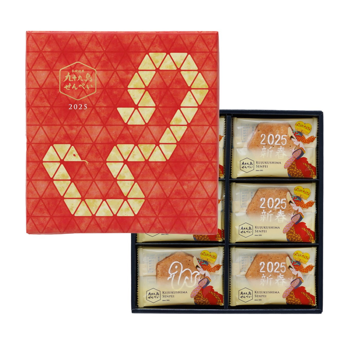 2025年新春は干支イラスト、そして「2025新春」の2種類の限定絵柄をご用意いたしました。新年の繁栄と幸福を願うにふさわしい『九十九島干支せんぺい』に仕上げた自慢の逸品です。