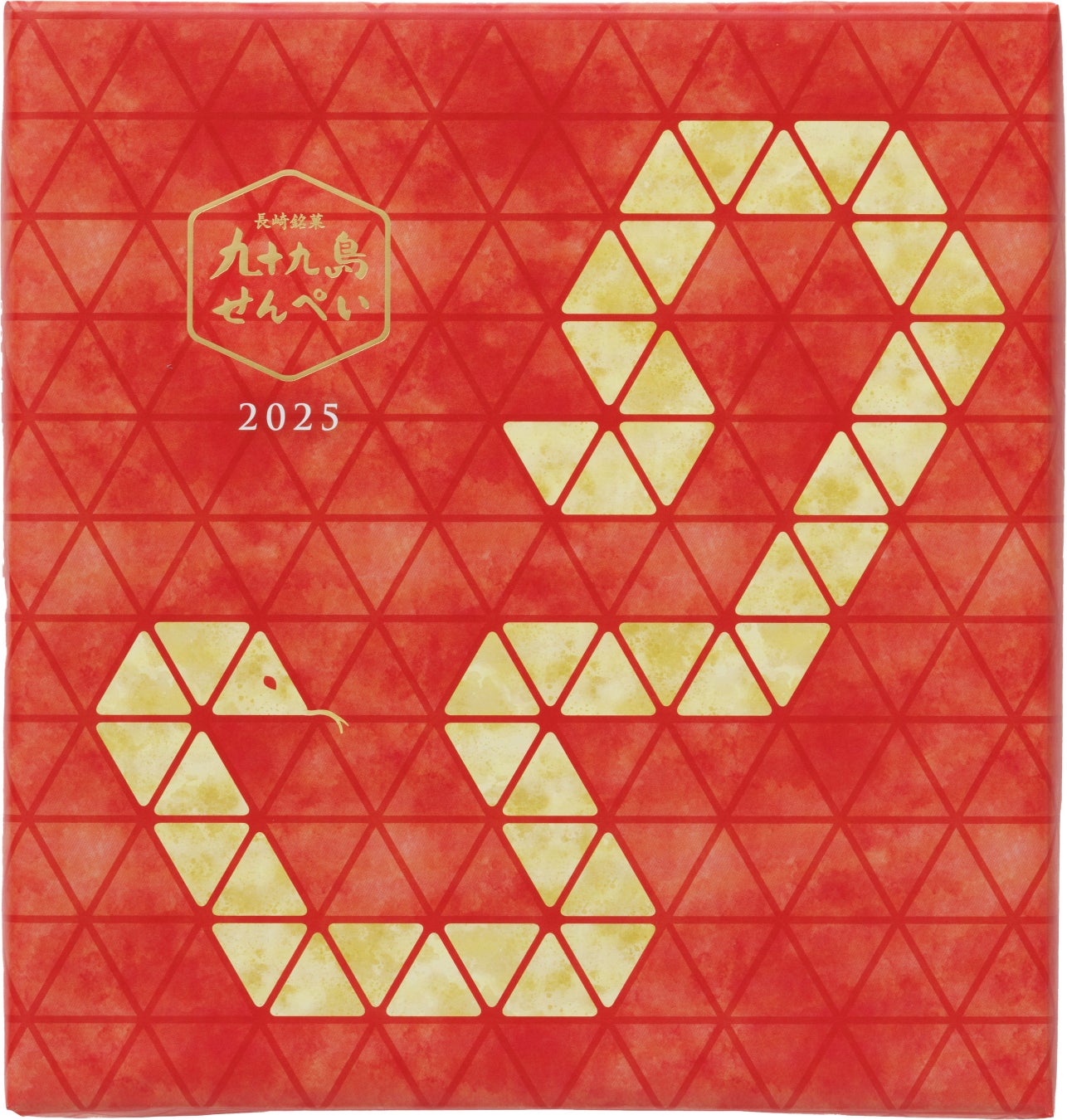 そんな縁起の良い九十九島せんぺいに、さらに2025年の「干支“巳”」と「新春」の2種の限定絵柄のりんがけで仕上げた、新しい1年を祝うにふさわしい『九十九島干支せんぺい』をご用意いたしました。大切な商品を包むパッケージにも、“巳”をモチーフにしたこの時期限定のデザインを施し、さらに特別感を演出いたします。