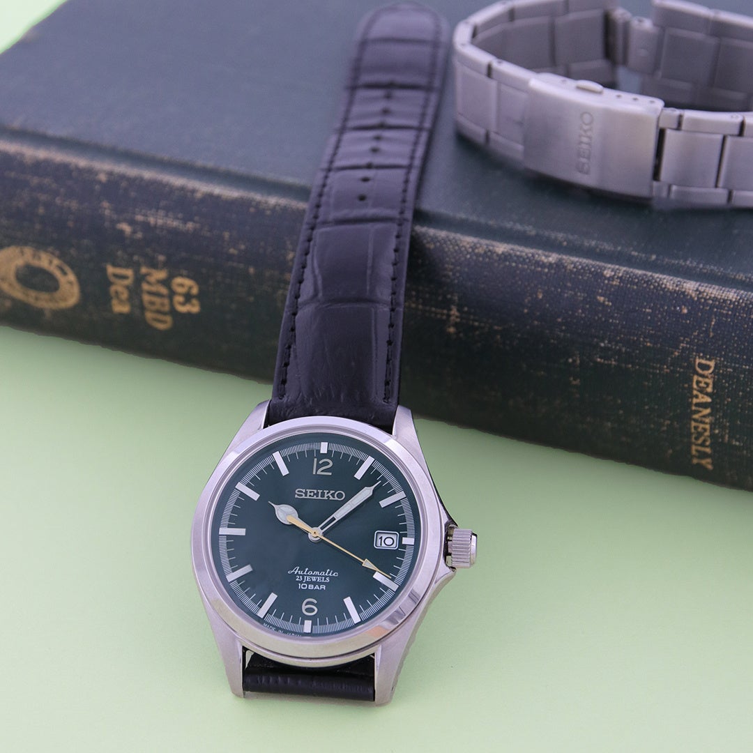 入荷と完売を繰り返す大人気のコラボモデルの新色「グリーンダイヤル」にバックルタイプのレザーベルトがとメタルベルトがセットになった特別なモデルを10本限定で発売します。上品な型押しモデルが腕元の品格を感じさせます。