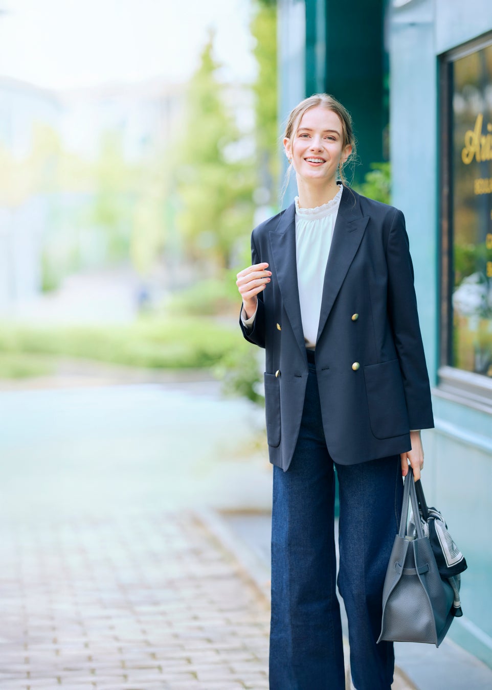毛羽立ちにくく微光沢感のあるウール素材とゴールドのボタンが洗練されたマニッシュな印象を与えるダブルブレザー。セミマットの金ボタンは、深みのあるネイビーによく映えるアテニア限定仕様で、素材からボタンまでディテールの品質を追及しました。ほどよくゆとりを持たせたシルエット、ヒップにかかる安心の丈感がバランスよく、大人女性のスタイルアップを叶えます。羽織るだけで着こなしがおしゃれに仕上がり、カジュアルもきれいめスタイルにも合わせやすい一着です。