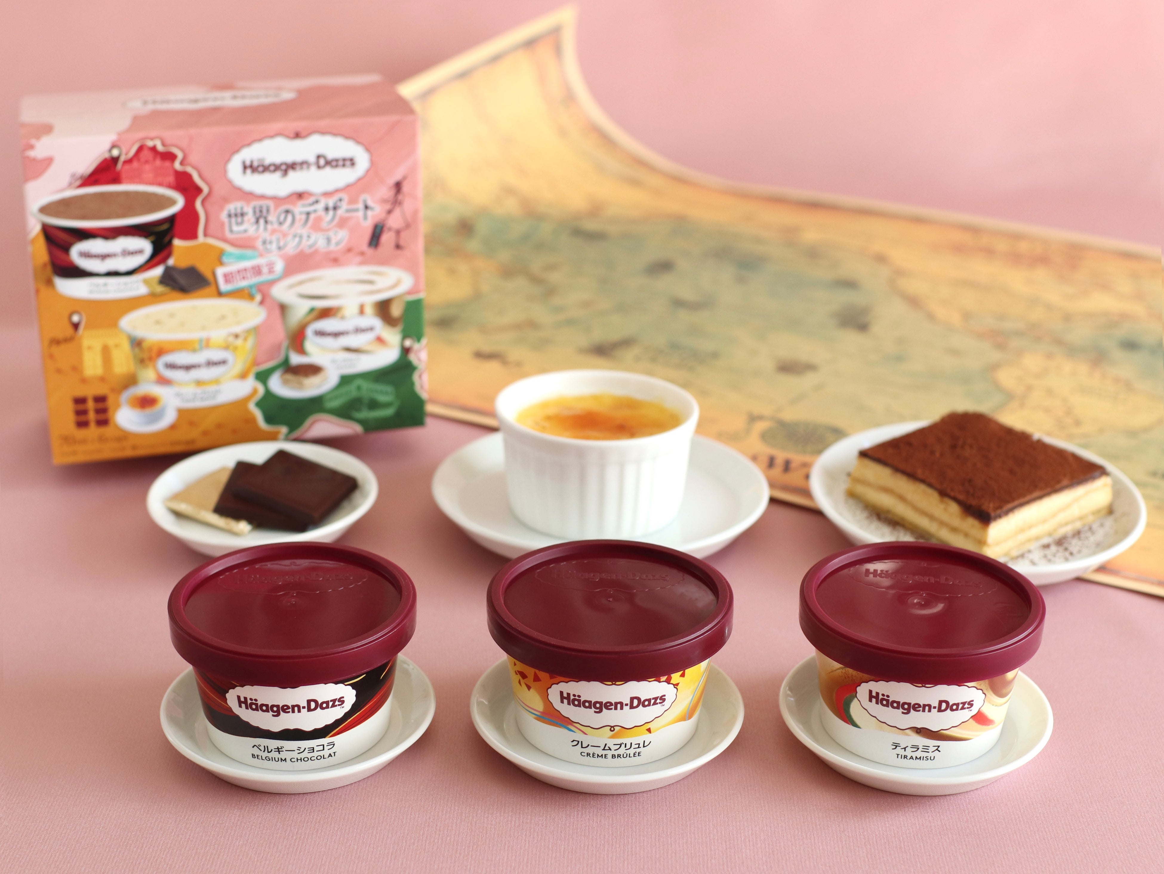 本商品は、世界のデザートをコンセプトに厳選した3種のフレーバーが楽しめる、詰め合わせ商品です。秋冬の季節ぴったりな世界中のデザートから、フランスが発祥の『クレームブリュレ』、ベルギーの『ベルギーショコラ』、イタリアの『ティラミス』の3種のフレーバーを厳選し、ハーゲンダッツらしいアイスクリームにアレンジしました。