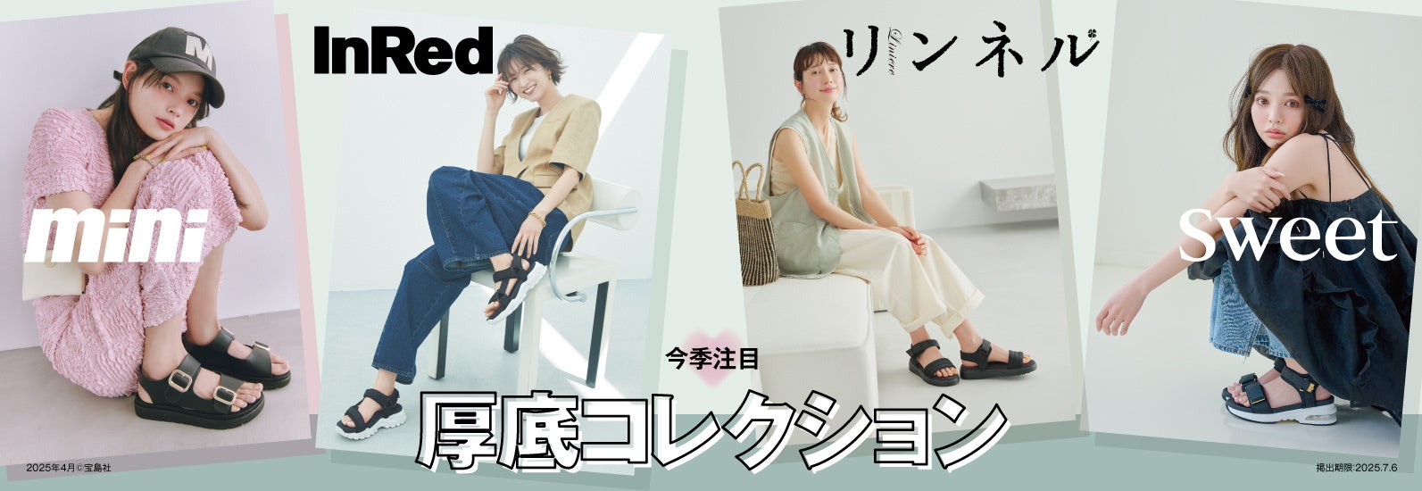 人気ファッション誌「InRed」「sweet」「mini」「リンネル」との4誌連動コラボ企画が4月7日よりスタート。今季注目の厚底サンダル&スニーカーコレクションが続々登場