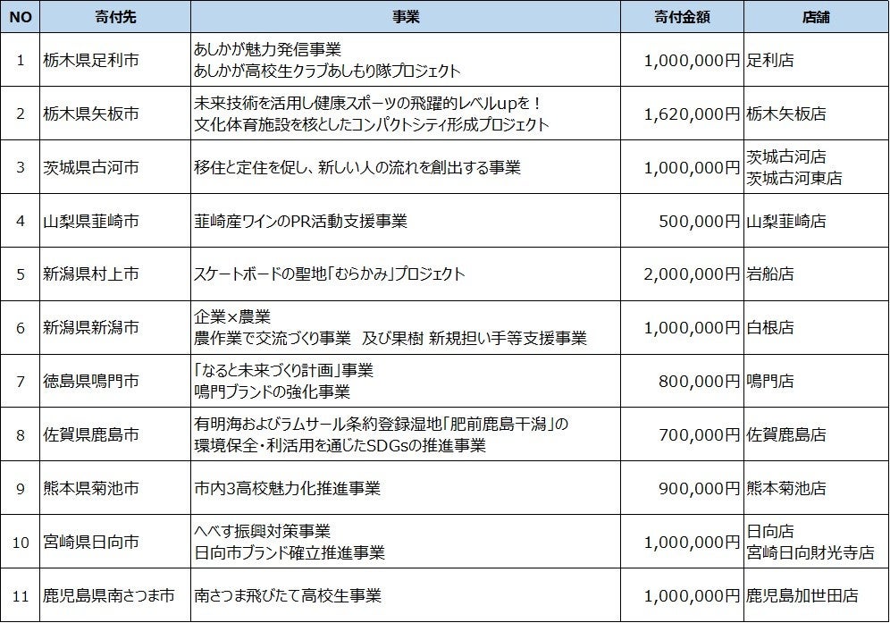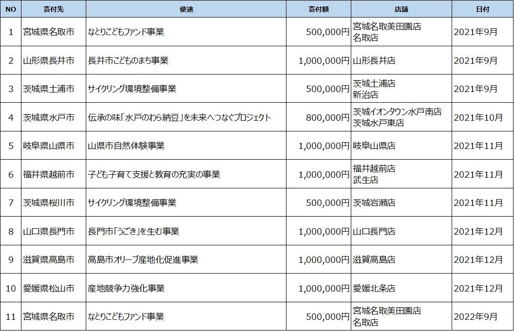 当社では、地域社会の発展に寄与するため、様々なボランティア支援・寄付活動を全国にて展開しております。企業版ふるさと納税を通じた寄付活動については2021年9月より実施しており、この度は9県11都市に新たに寄付させていただきました。