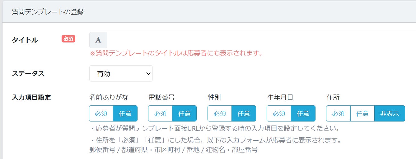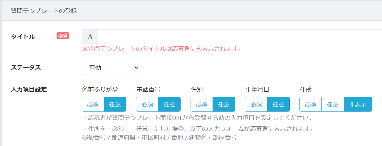 ※質問テンプレート登録画面イメージ。 住所は必須、任意に加えて項目を非表示にすることも可能