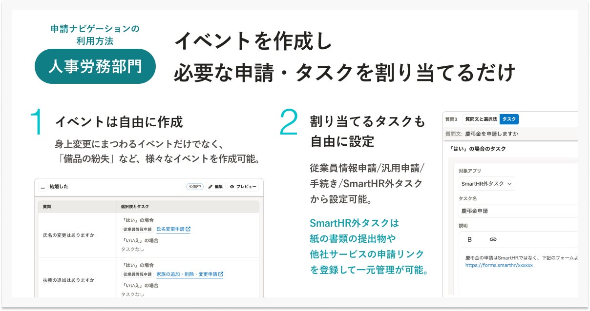 株式会社SmartHR(本社:東京都港区、代表取締役CEO:芹澤 雅人)が運営するクラウド人事労務ソフト「SmartHR(スマートエイチアール)」は、身上変更やイベントの手続きを効率化する「申請ナビゲーション」機能を11月11日より提供開始します。