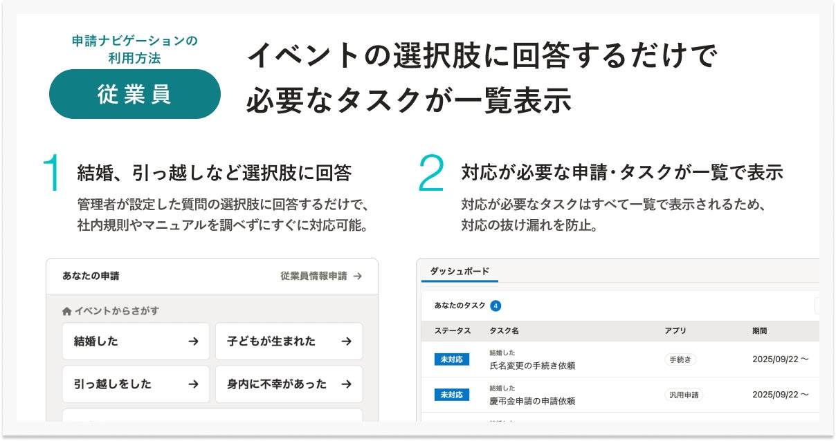 本機能は、従業員が社内のマニュアルを探す必要なく、選択肢に回答するだけで一人ひとりに必要な申請やタスクが可視化され、従業員の申請ミスを削減し、人事労務担当者による問い合わせ対応や確認・差し戻し業務の負荷を軽減します。