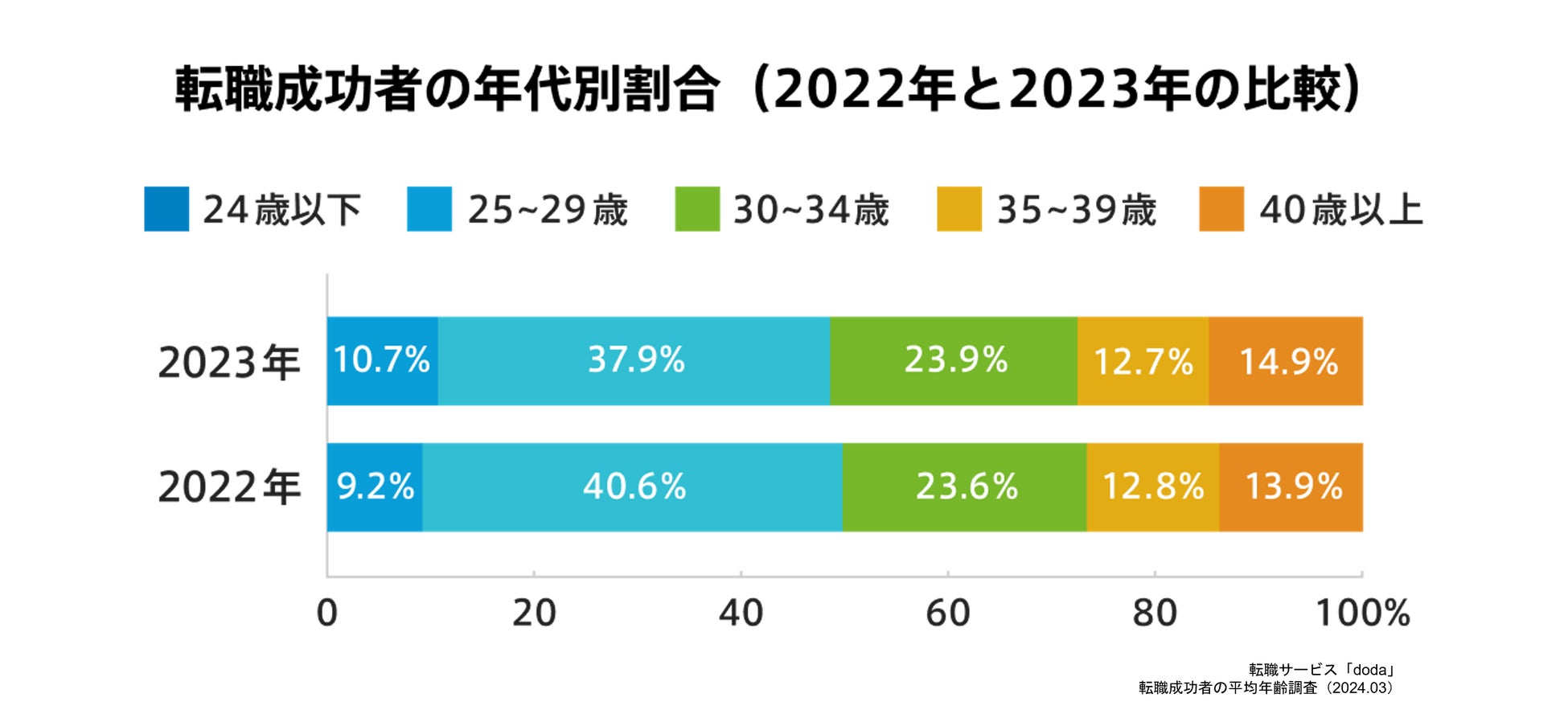 ・転職成功者数はすべての年代で増加し、前回から124.2%。増加率が最も大きかったのは「20代前半」で144.9%、それに「40代以上」が133.0%で続く