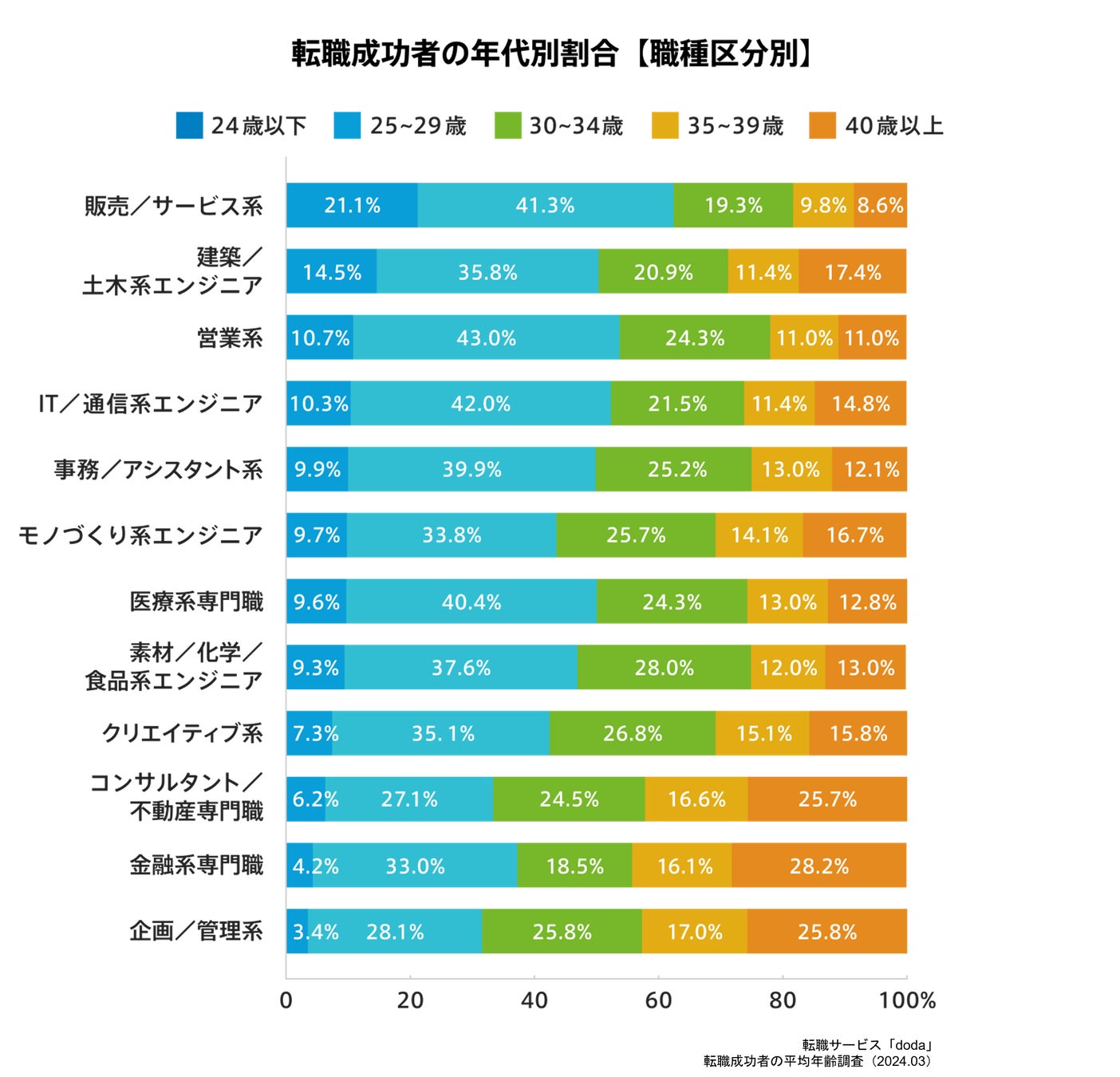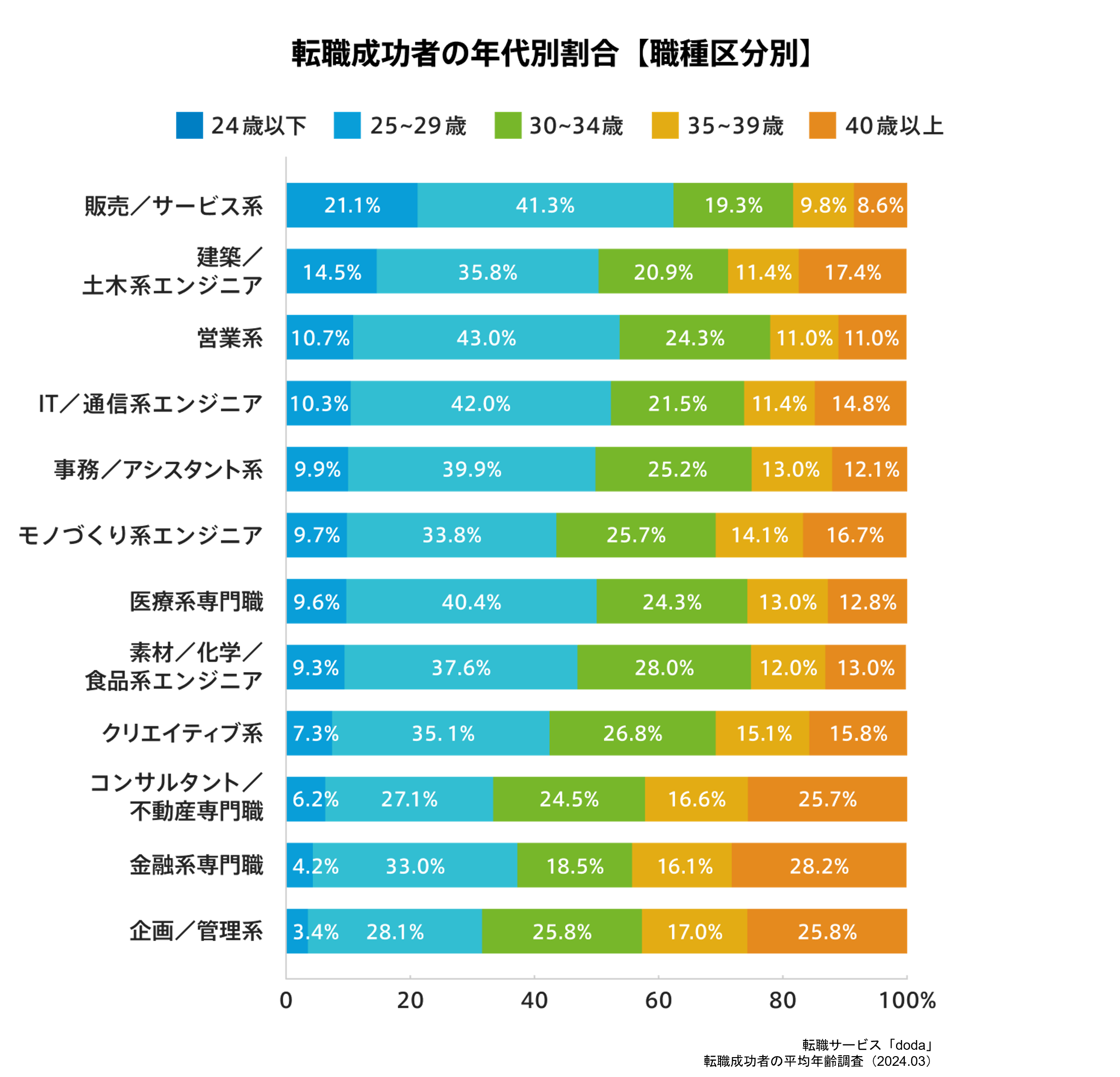 転職成功者の年代別割合を職種別で見ると、