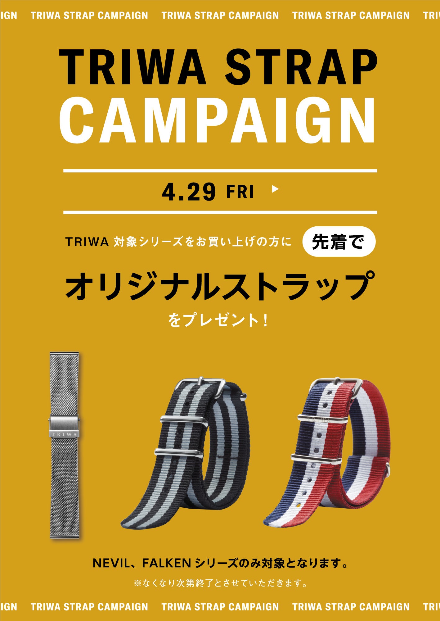 内容:期間中、TRIWAの腕時計(NEVIL・FALKENシリーズ)をご購入の方に先着でストラップをプレゼントします。