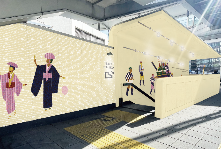 更に、山笠やどんたくをイメージしたグラフィックウォールにはちょっとした模様も隠れており、博多の街のにぎわいを演出します。