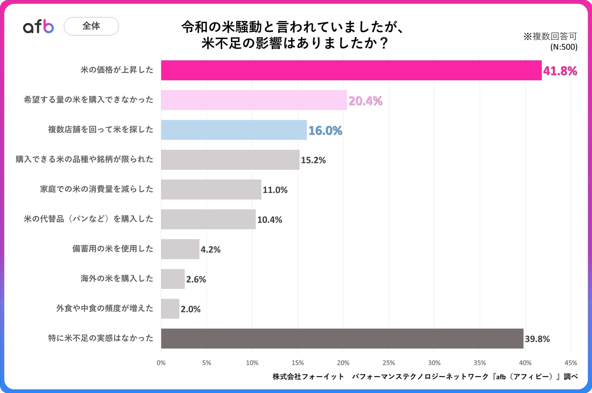 その内訳を見てみると、最も多かった回答は「米の価格が上昇した」で41.8%となりました。次いで、「希望する量の米を購入できなかった」が20.4%、「複数店舗を回って米を探した」が16.0%で続くという結果になりました。また、「特に米不足の実感はなかった」と回答した方は39.8%でした。