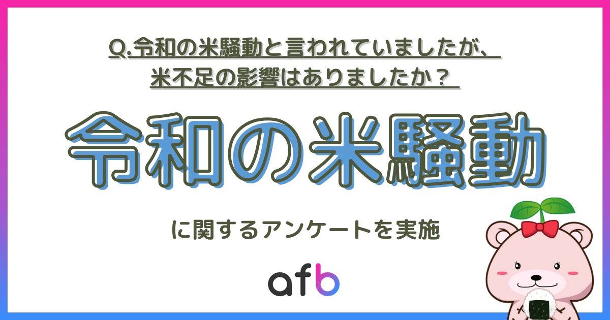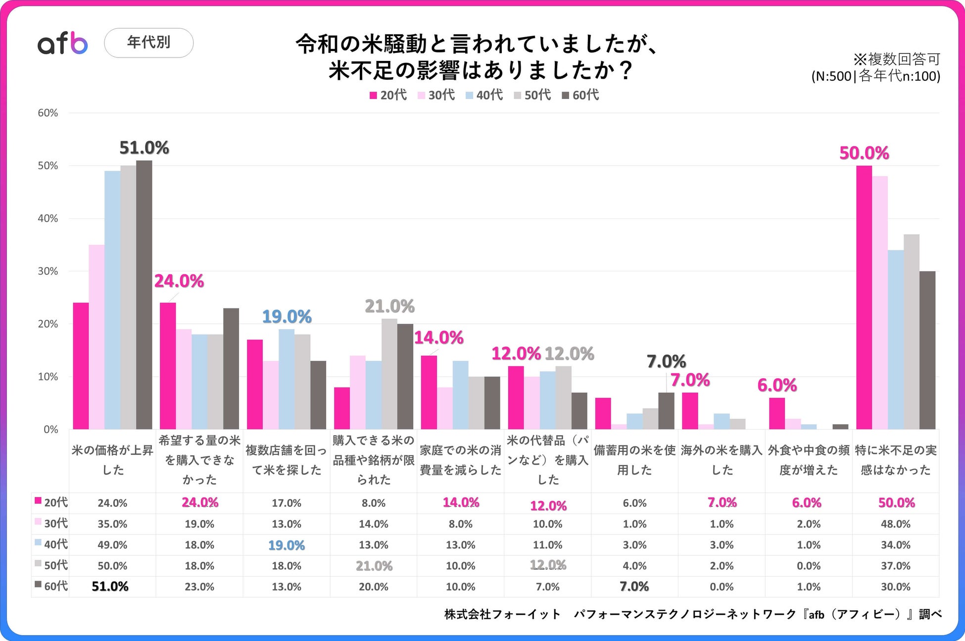 アフィリエイトプラットフォーム「afb(アフィビー)」< https://www.afi-b.com/ >の開発運用をおこなう株式会社フォーイットは、全国の20代~60代までの男女500人を対象に米不足に関するアンケートを実施し、年代別等の特徴についてまとめました。