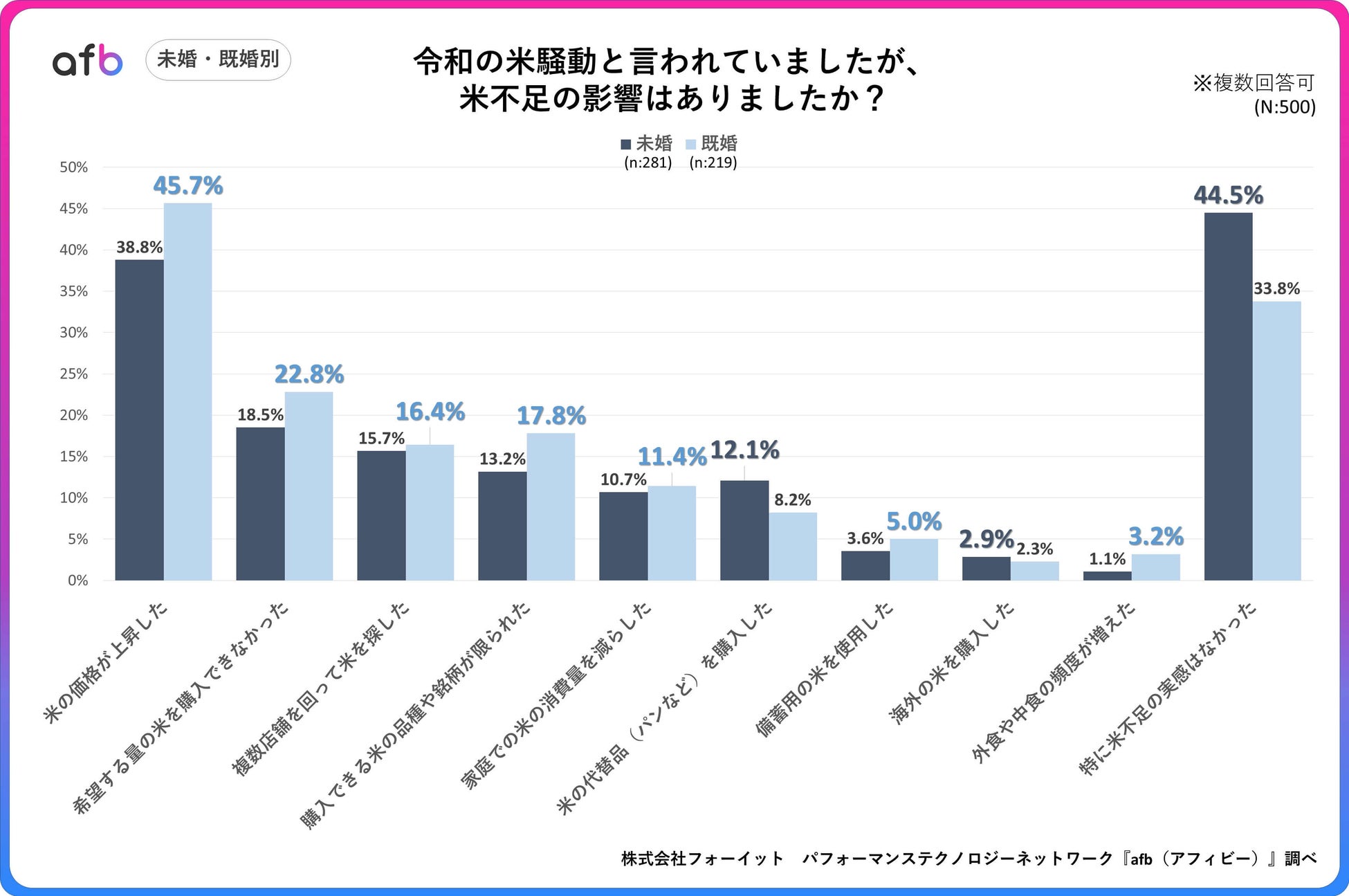 未婚・既婚別で見ると、米不足の影響を感じた方は既婚の方が10%以上多くなりました。既婚の方の場合、子どもがいる家庭も多くなることから必然的に米の消費量が増えるため、米価格の上昇や流通量の減少による影響が大きくなったと考えられます。その一方で、未婚の方は「米の代替品(パンなど)を購入した」と回答した方が既婚の方よりも多く、米にこだわることなく柔軟に対応していた方も多かったようです。