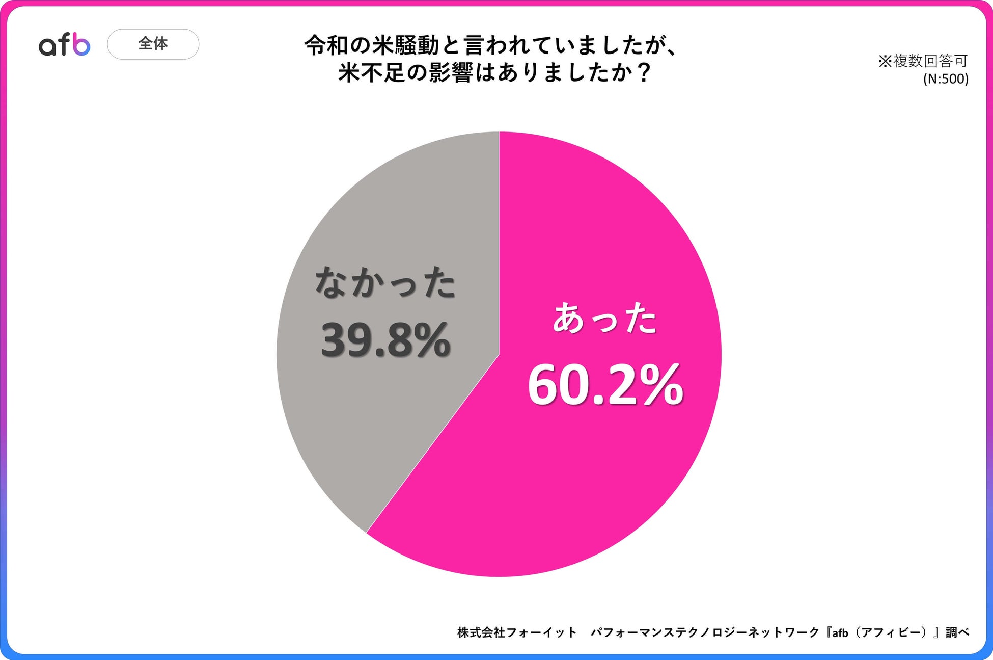 全国の20代〜60代の男女を対象に、「令和の米騒動と言われていましたが、米不足の影響はありましたか?」というアンケートを実施したところ、「あった」と回答した方は60.2%でした。