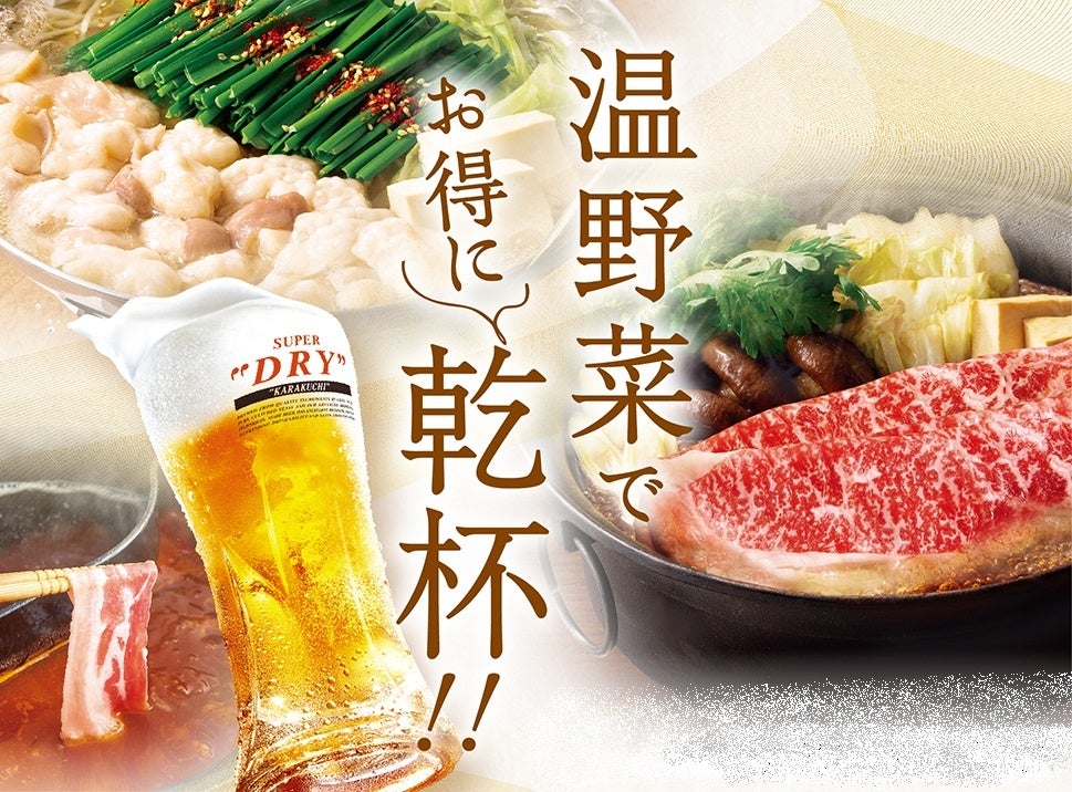 コロワイドグループの株式会社レインズインターナショナルが展開するしゃぶしゃぶ温野菜(以下「温野菜」)では、2月5日から2月29日までの平日のみ、アプリ会員限定で生ビールやハイボールが何杯飲んでも1杯390円(税込429円)で楽しめる「温野菜でお得に乾杯!!」フェアを実施します。