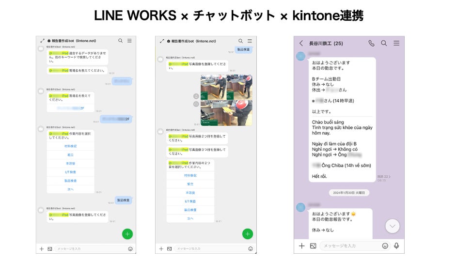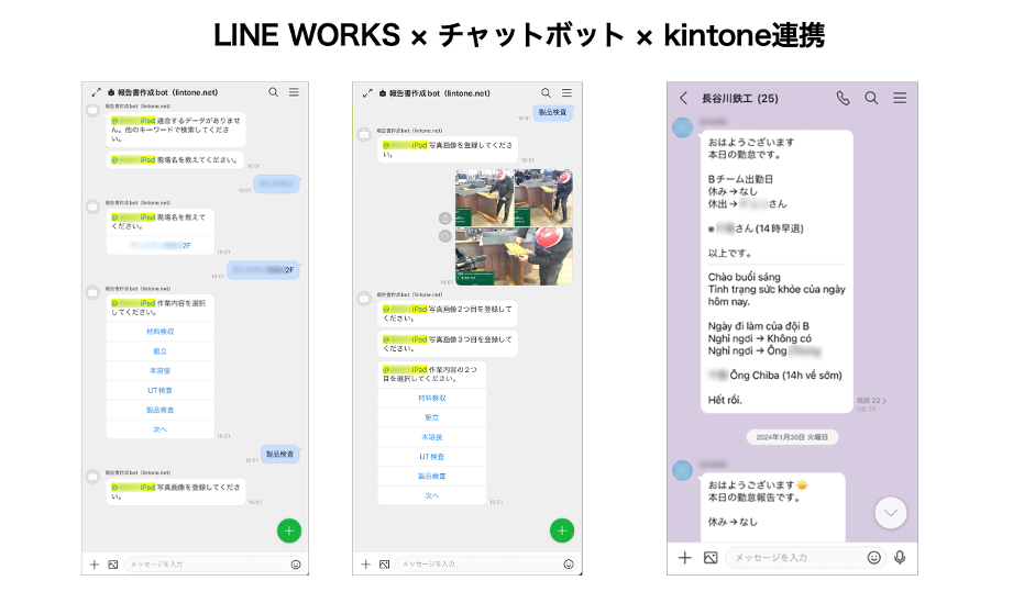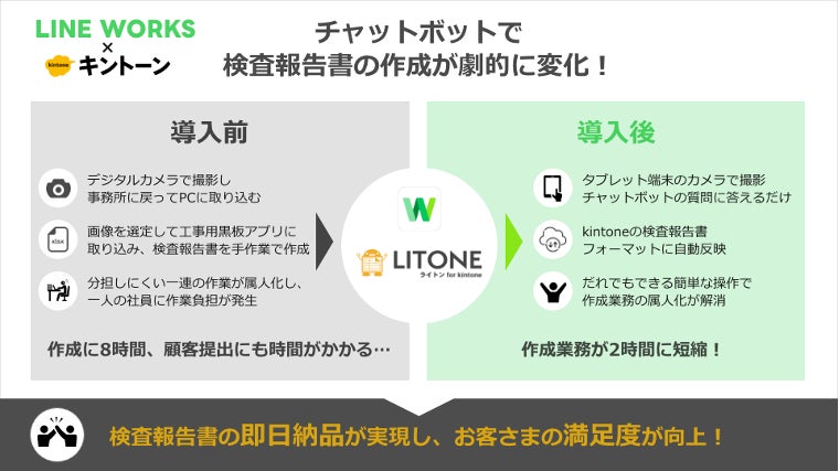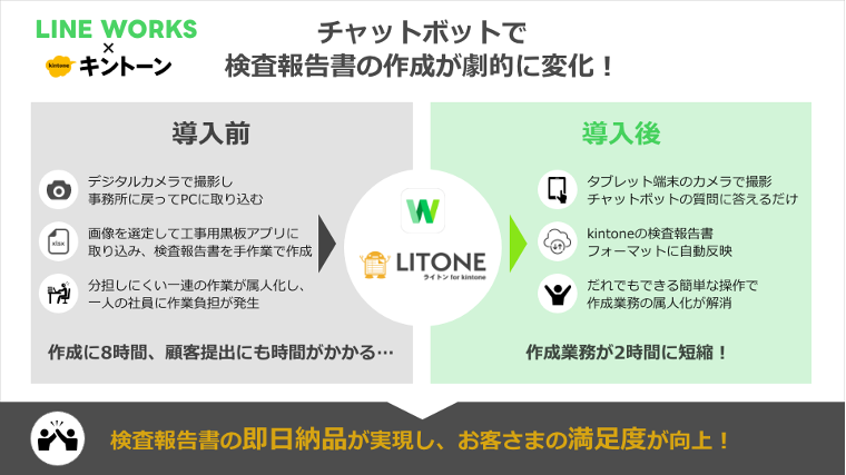 LINE WORKS×チャットボット×kintone連携により現場から検査報告書の作成が可能に。自動作成スキームの構築により、作成時間を75%削減!