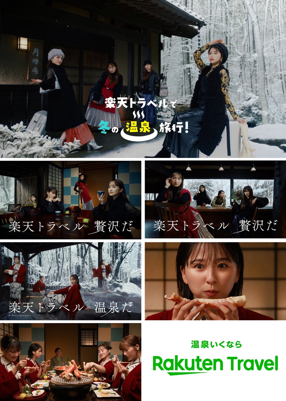 新CM「楽天トラベルで冬の温泉旅行編」は、「冬の贅沢なおこもり温泉旅行」をテーマに作られ、大分県の由布院温泉で撮影を行いました。CMは、ももいろクローバーZの4人が温泉宿を背景にクールにポーズを決めている映像から始まり、後半は浴衣姿で美味しそうに蟹料理を囲む、おこもり温泉旅行の魅力が詰まった構成となっています。
