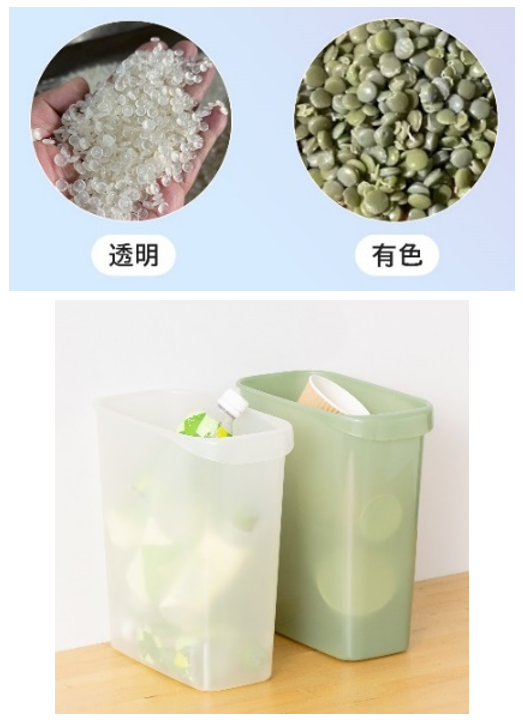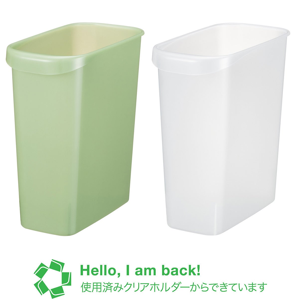 回収した使用済みクリアホルダーは、「透明」と「色・柄・文字入り」の2種に分別され、その後それぞれ「透明」、「有色」2種の再生ペレットに加工されます。そのため、本商品は半透明と有色(アースカラー)の全2色での展開となります。無着色で半透明な本商品は、仕事場や自宅でのゴミが分別しやすい仕様となっています。