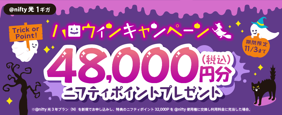 「ハロウィンキャンペーン」では、2025年10月17日(金)~11月3日(月)の期間中に「@nifty光」公式サイトまたは電話から「@nifty光 3年プラン(N)」の新規申込を行い、その後開通が確認できた方を対象に、「ニフティポイントクラブ」のポイント(以下、ニフティポイント)32,000ポイントをプレゼントします。
