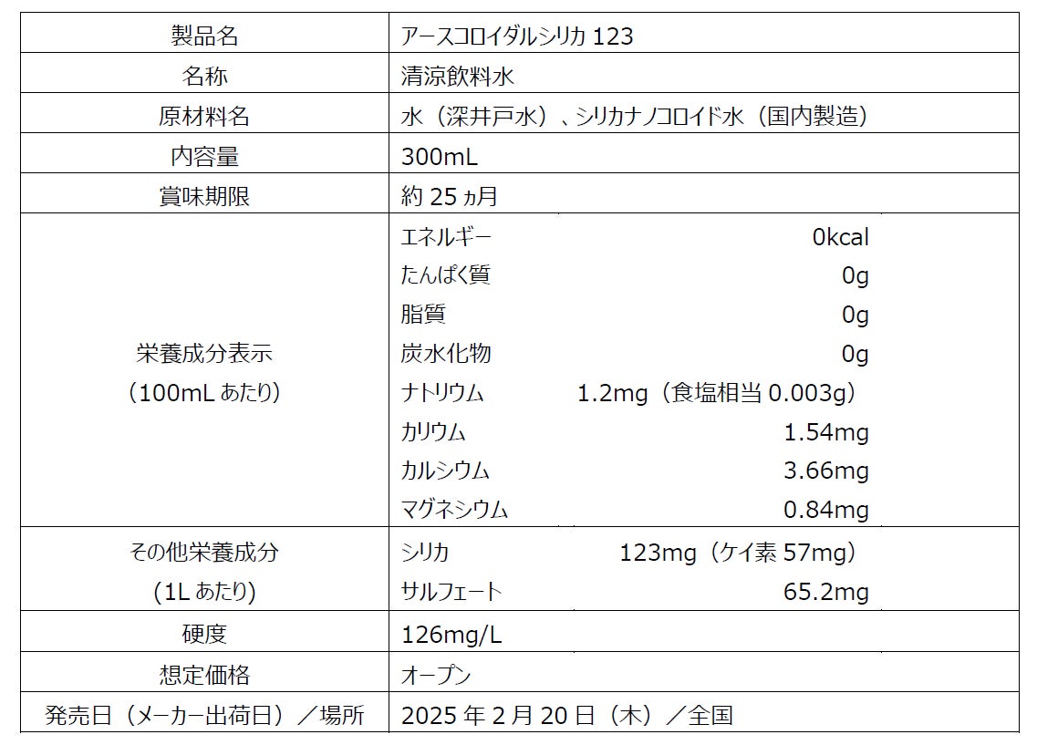 当社が2023年2月に発売した『アースコロイダルシリカ100』は、霧島神宮が鎮座する鹿児島県にある霧島錦江湾国立公園敷地内の地下144mの岩盤から汲みだしたシリカを含有するミネラルウォーターと、純度の高いクリスタルシリカを長期熟成させることによりナノコロイド化した製品です。発売後、「まろやかで飲みやすい」とご好評をいただいています。今回、「手軽にシリカ水を摂取したい」「様々なシーンでシリカ水を活用したい」という声に応え、300mL飲み切りサイズの『アースコロイダルシリカ123』を発売します。