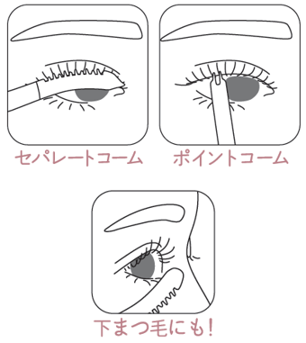 「セパレートコーム」は、マスカラのダマを取りながらカールアップさせたい時や、まつ毛のくせ直しに。「ポイントコーム」は、くっついたまつ毛を分けながら、毛流れの微調整が可能です。