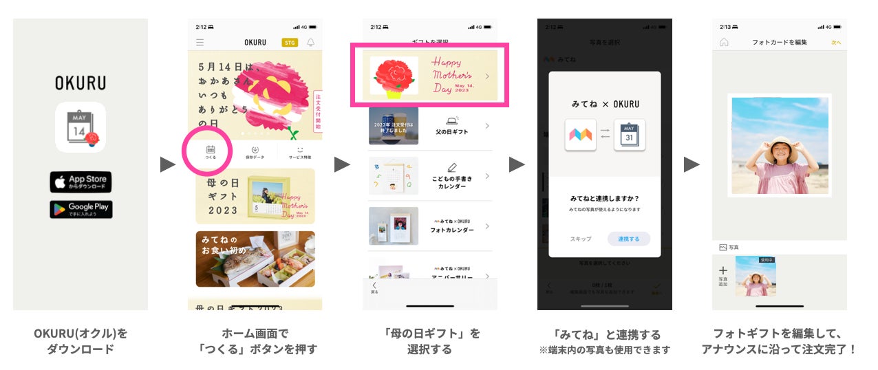 ご注文は「OKURU」アプリ内から行います。アプリトップ画面で「つくる」ボタンを押し、「母の日ギフト」からギフトを選びます。一緒に贈る写真は「みてね」と連携することで、「みてね」上にアップロードしている写真を簡単に使用できます。また、スマートフォンに保存している写真の中から選択することも可能です。フォトカードを編集し、アナウンスに沿って注文完了となります。