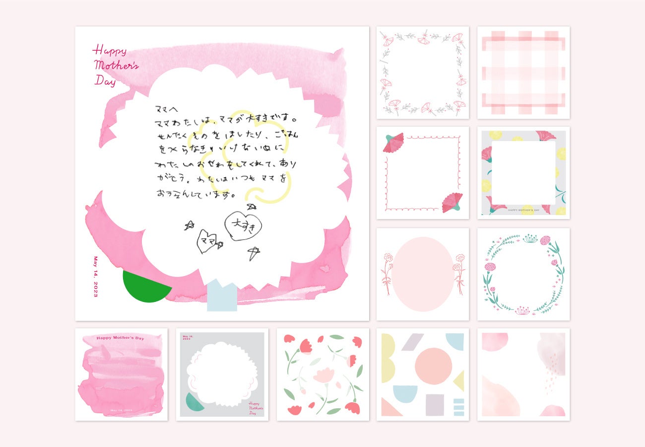 また、「みてね母の日ギフト」の注文で大好評のメッセージカードが無料でご利用いただけます。今年はメッセージカードのカードデザインを10種類以上追加し、お好きなカードデザインで感謝の気持ちを伝えることができます。