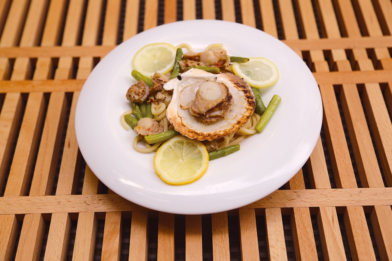 殻付き大粒ホタテをぜいたくに使い、アスパラの香りを存分に引き出したオイルにレモンを添えることで、ホタテの旨味ととレモンの酸味を楽しめます