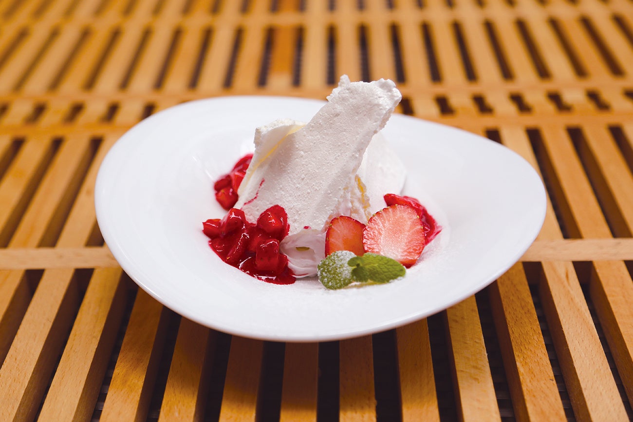 サクサクのメレンゲを崩しながら中のアイスクリームとホイップクリーム、イチゴと一緒にお召し上がりください