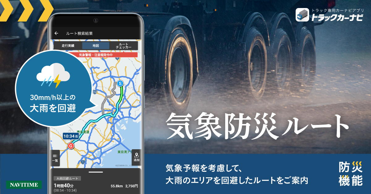 『トラックカーナビ』、気象予報を考慮して迂回する「気象防災ルート検索」提供開始